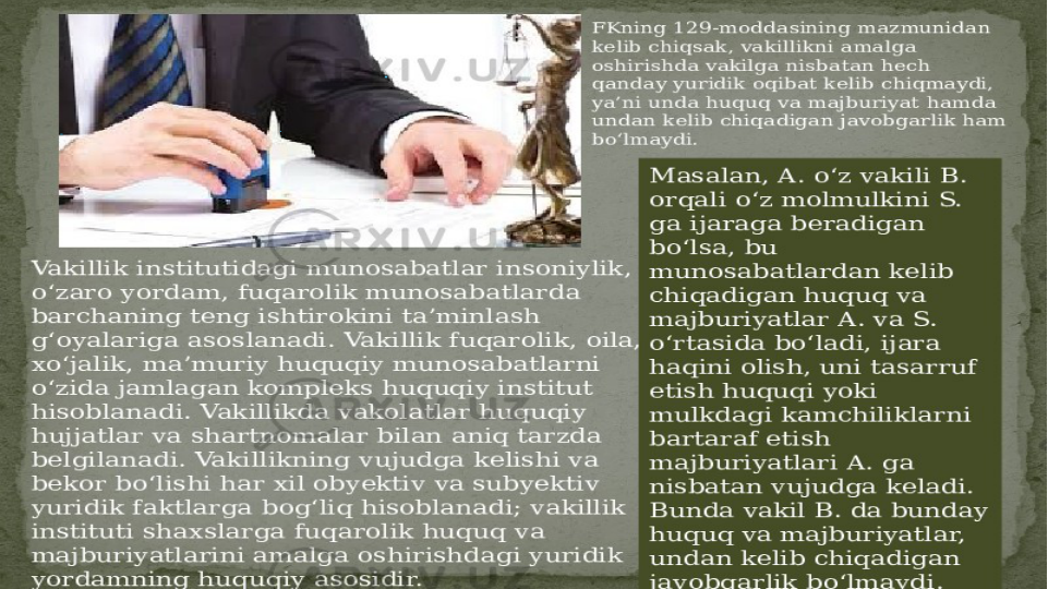 oladi (shartnomali vakillikda huquq va majburiyatlarni amalga oshirish maxsus